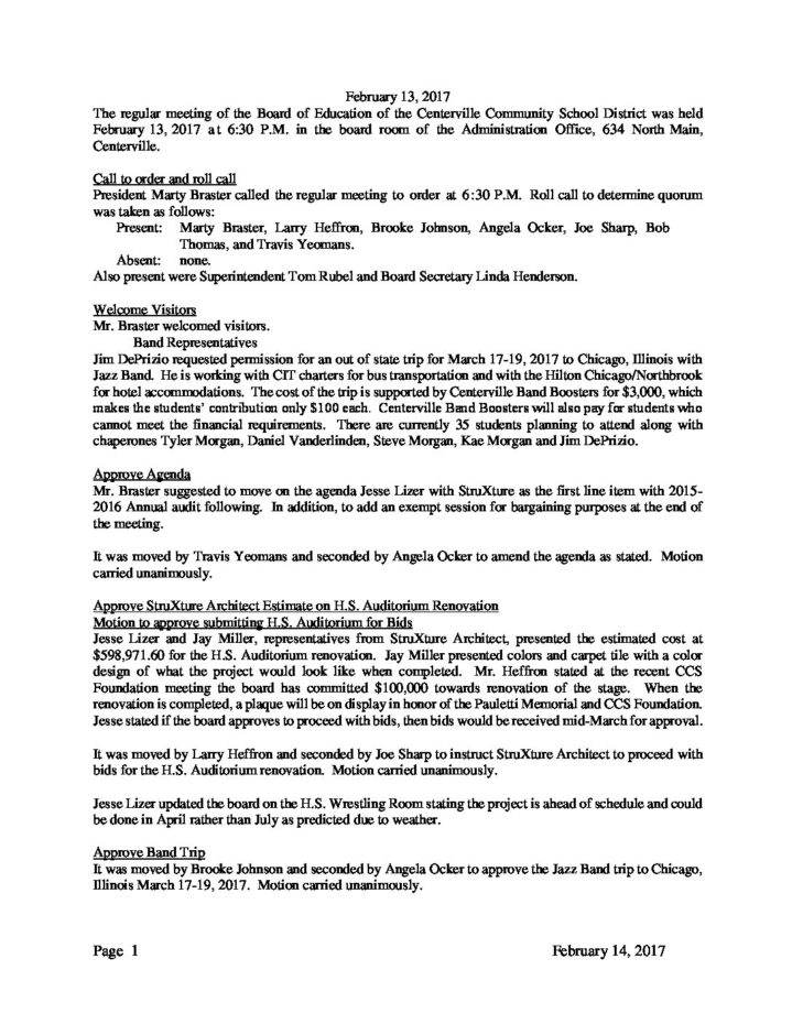 February 13, 2017 Centerville CSD Board Minutes February 13, 2017 Centerville CSD Board Minutes Skip back to navigation